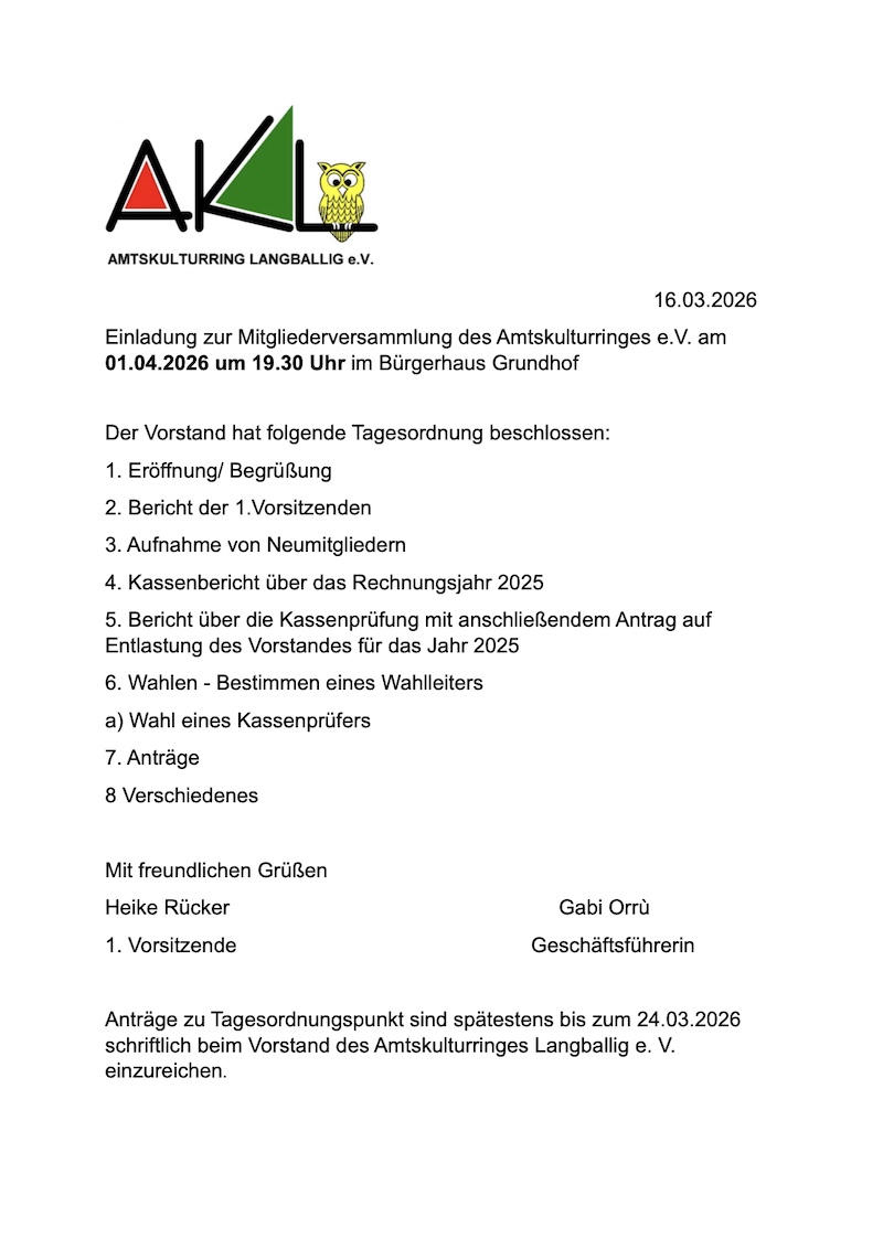 | 01.04.2026 | Mitgliederversammlung Amtskulturring Langballig e.V. im Bürgerhaus Grundhof | 19:30 |